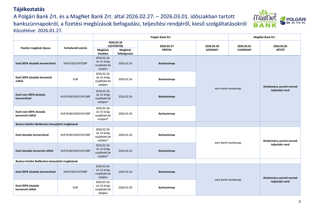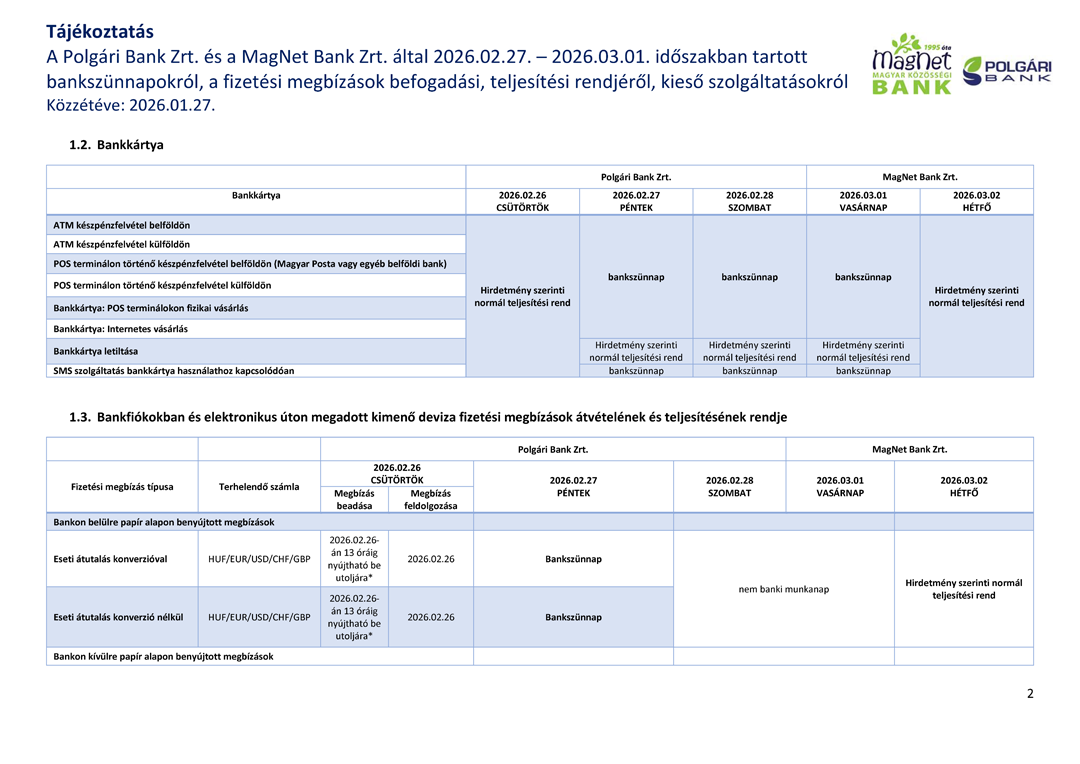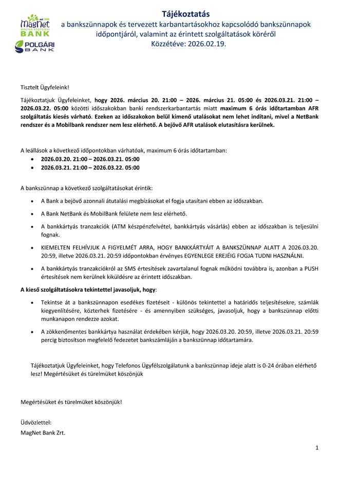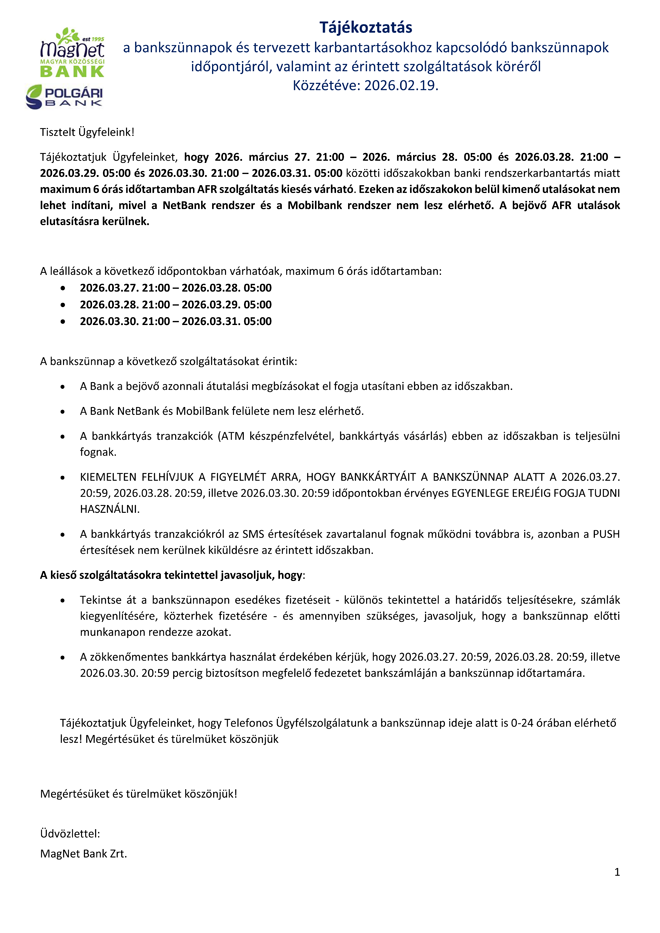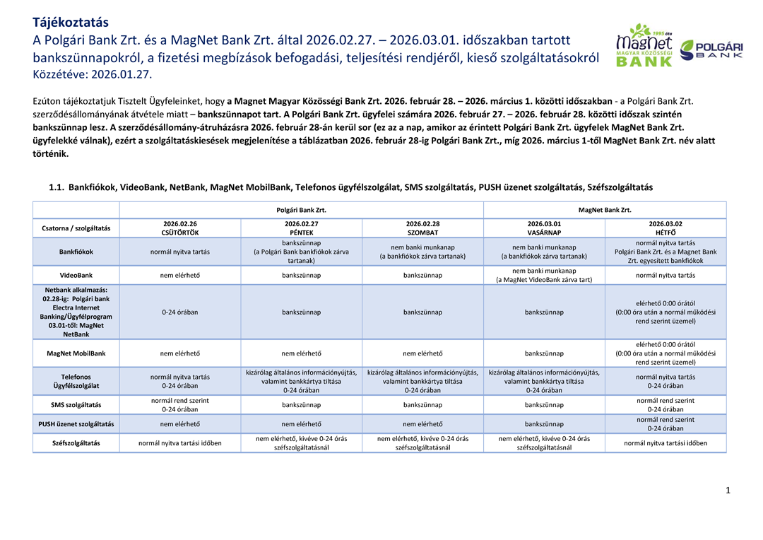 Tájékoztatjuk, hogy a Polgári Bank Zrt. és a MagNet Bank Zrt. 2026. február 27 – 2026. március 01 közötti időszakban bankszünnapot tart.