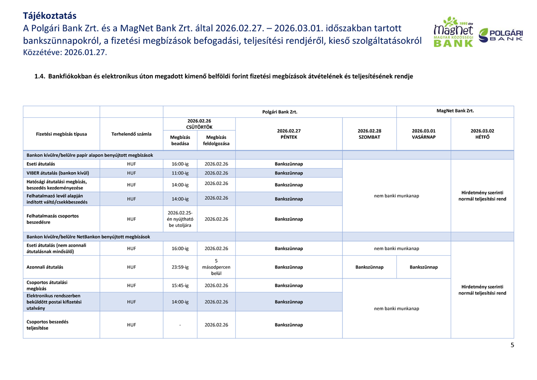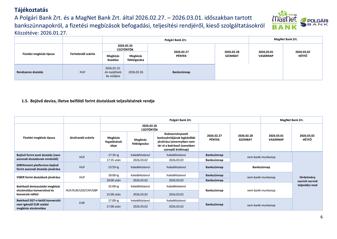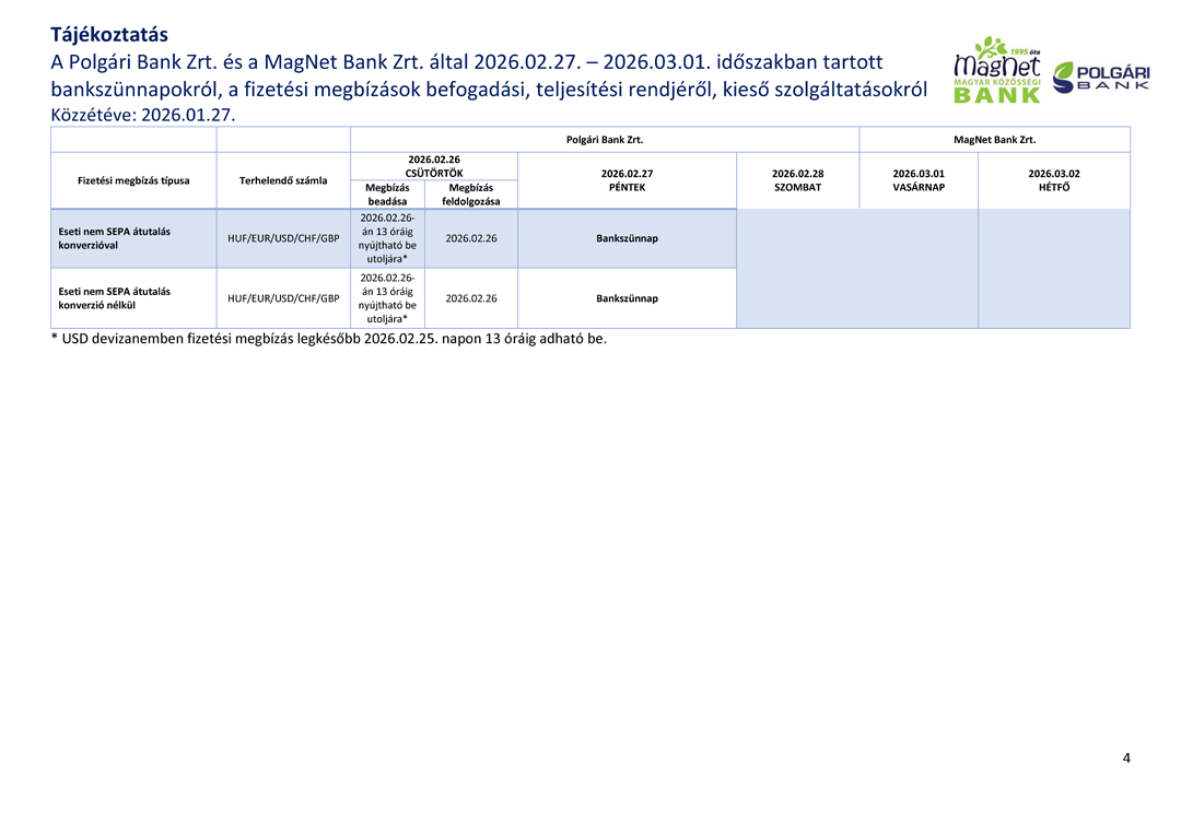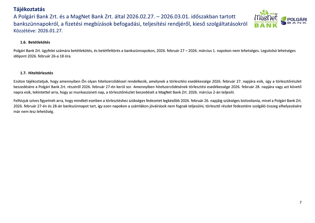Tájékoztatjuk, hogy a Polgári Bank Zrt. és a MagNet Bank Zrt. 2026. február 27 – 2026. március 01 közötti időszakban bankszünnapot tart.